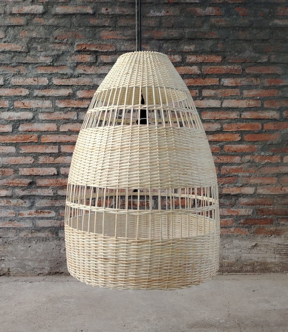La lámpara de mimbre modelo Ofelia, está elaborada 100% de forma artesanal, tejida con fibras naturales propias de la zona de Chimbarongo. Su tonalidad refleja el color característico del mimbre natural, resaltando su autenticidad y calidez.